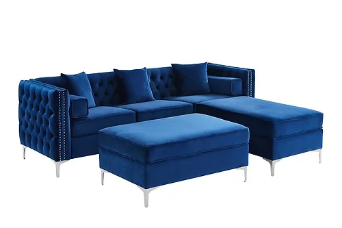Blue Velvet Reverisble Sofa Sectional With Deep Tufting and nailhead Details, Chrome legs and Accent Pillows.
