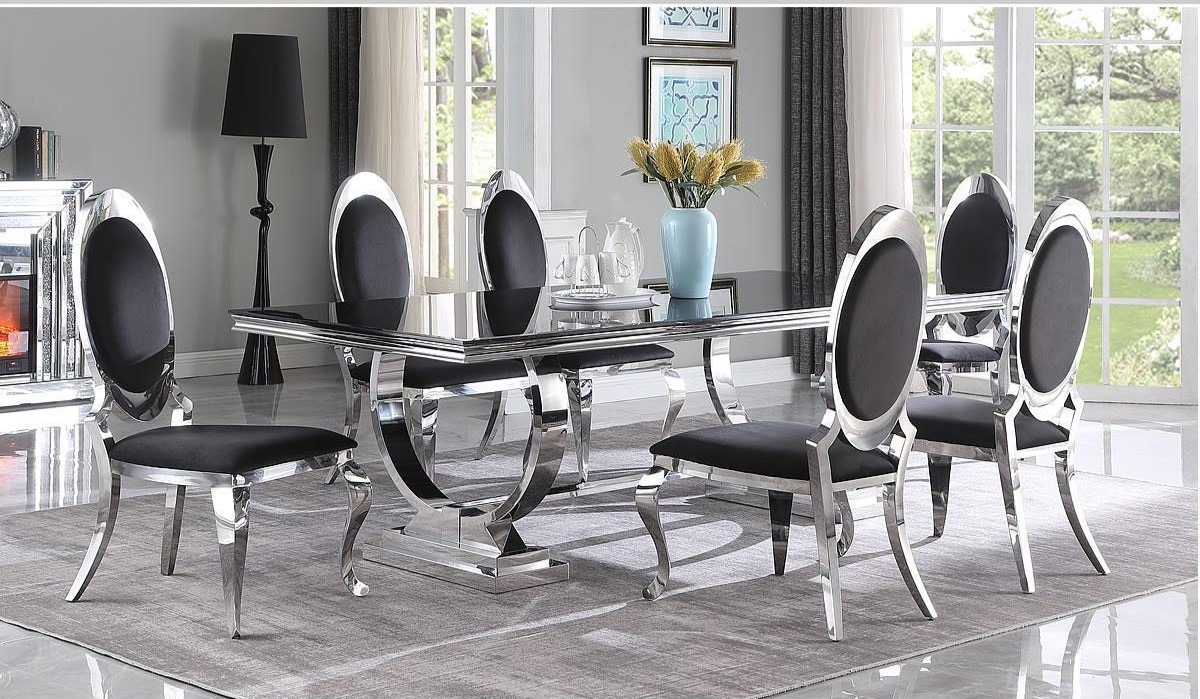 The large 94″ rectangular top is finished in black with silver legs, flaunted in a ring-like circular design atop two silver-tiered bases. Paired with a set of modern velvet chairs in black, this dazzling table is an amazing centerpiece of any dining room.